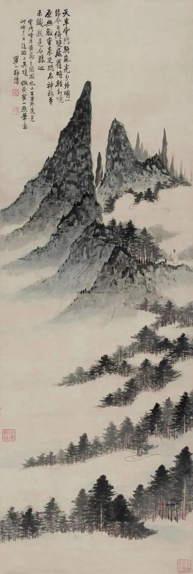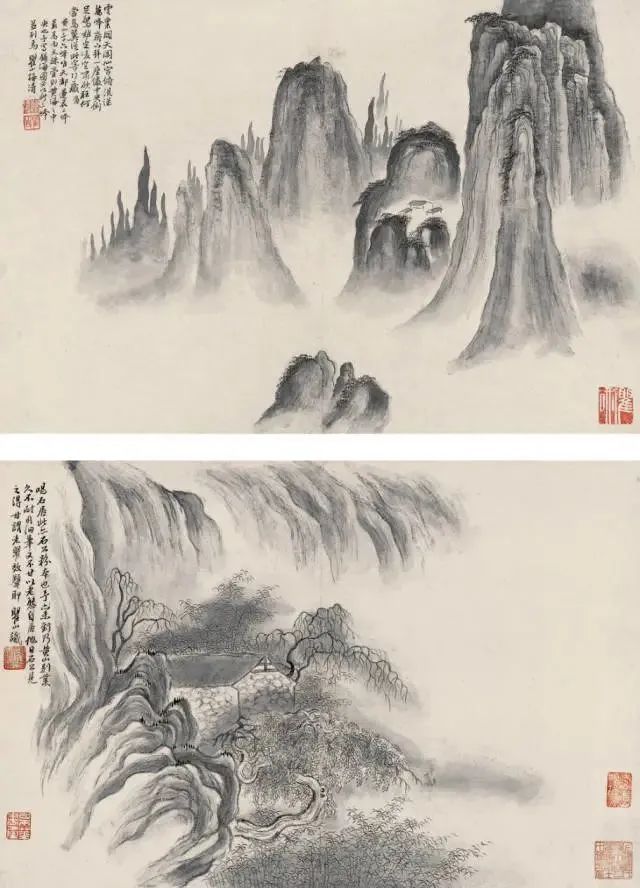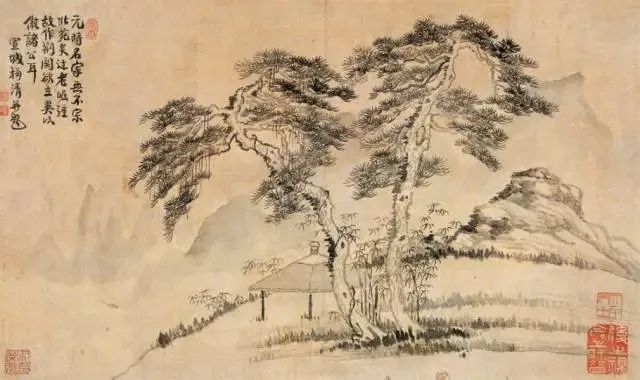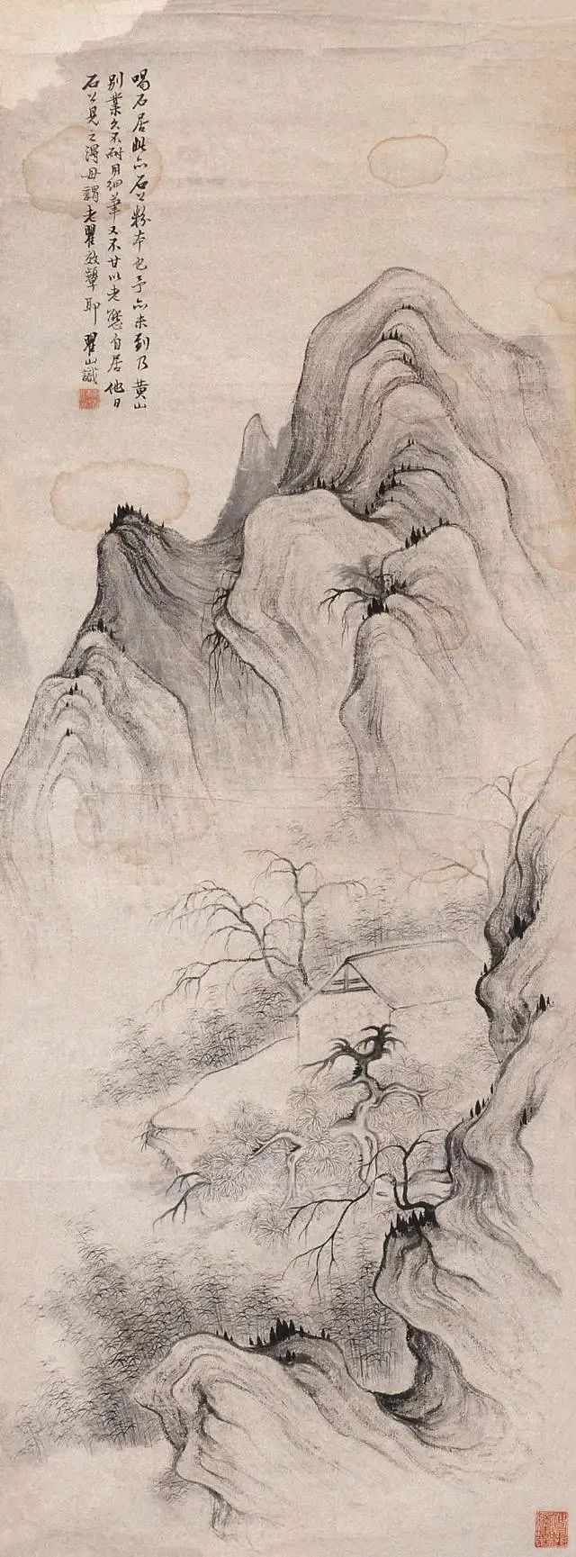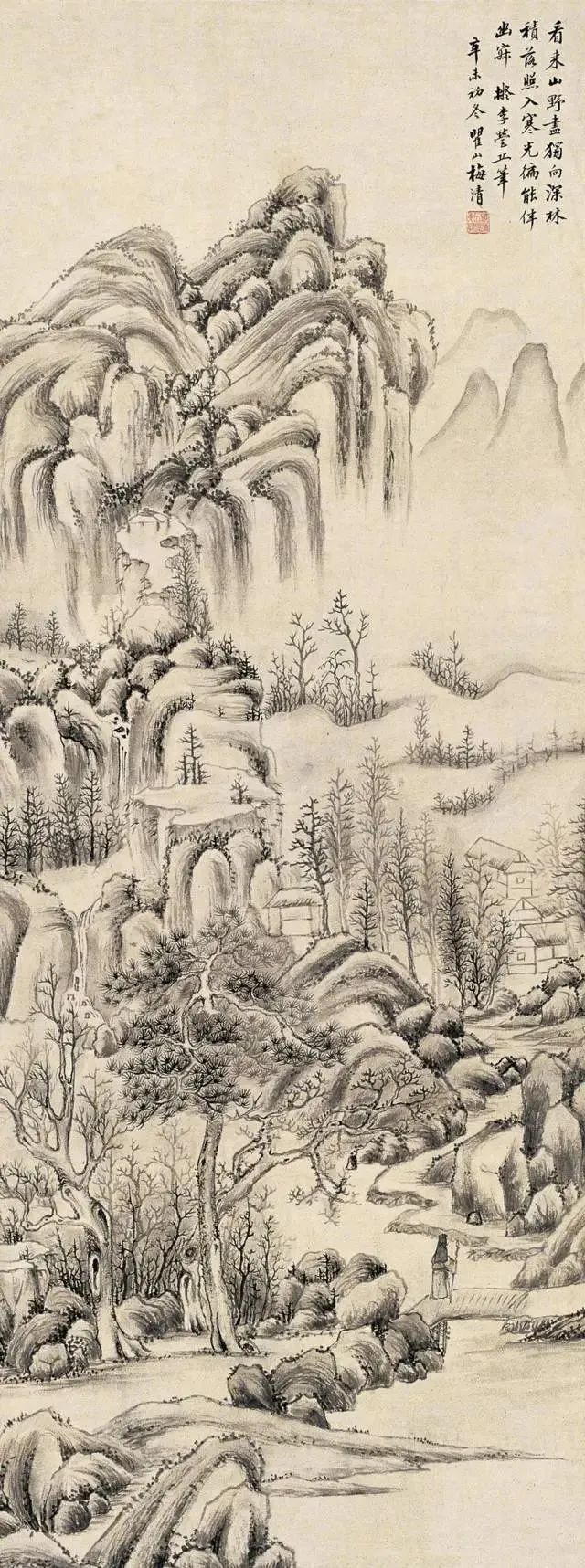 梅清之山水画,构图精妙,布局合理。其画中之山川、云雾、松柏、溪流等物,皆能巧妙安排,相得益彰。或远山如黛,近水含烟;或松柏苍翠,溪流潺潺;或云雾缭绕,山峦隐现。皆能营造出一种深远、幽静、神秘的意境,令人心驰神往。